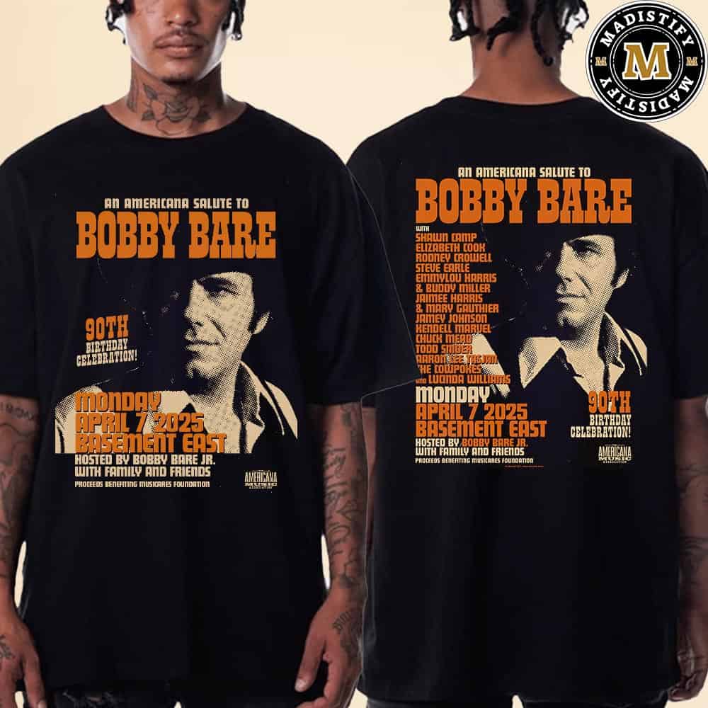 Introducing the An America Salute To Bobby Bare 90th Birthday Celebration Apr 7 2025 The Basement East 917 Woodland St Nashville TN Two Sides Merchandise Unisex T-Shirt: Elevate Your Daily Look with Unmatched Comfort, Exceptional Quality, and Infinite Versatility!