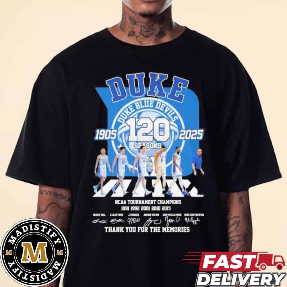 Duke Blue Devils NCAA Tournament Champions 120 Years 1905-2025 Thank You For The Memories Road Abbey Signatures Vintage T-Shirts