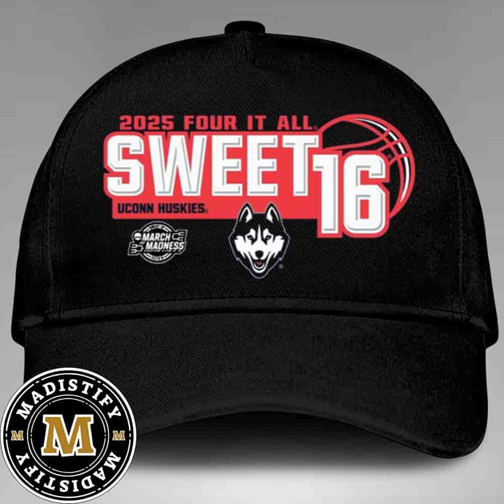 Crafted and brought to life by Madistify, Uconn Huskie NCAA March Madness 2025 Four It All Sweet 16 Hat-Cap Trucker Hat stands as a testament to our commitment to excellence.